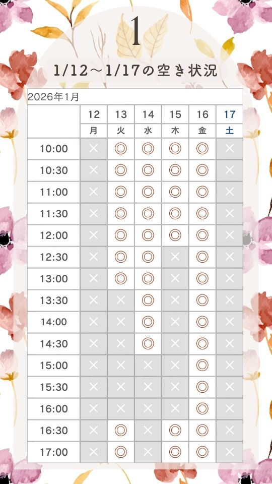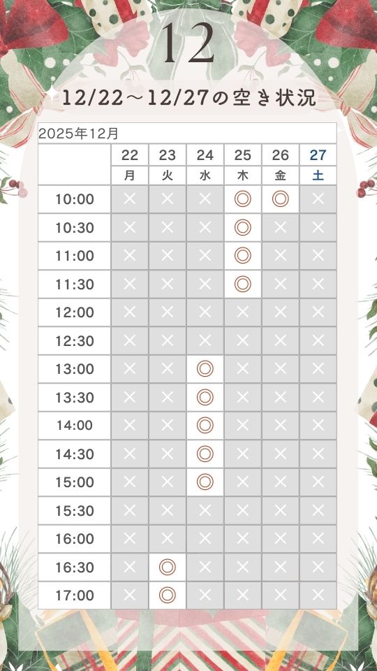 2025年12月-2026年1月の空き状況のお知らせです。 予約状況は日々変更がございますので、予約時にお問い合わせください。 ※毎週日曜日は定休日となっております。ただいま時短営業中につき、18:00終了までのご予約とさせていただいております。